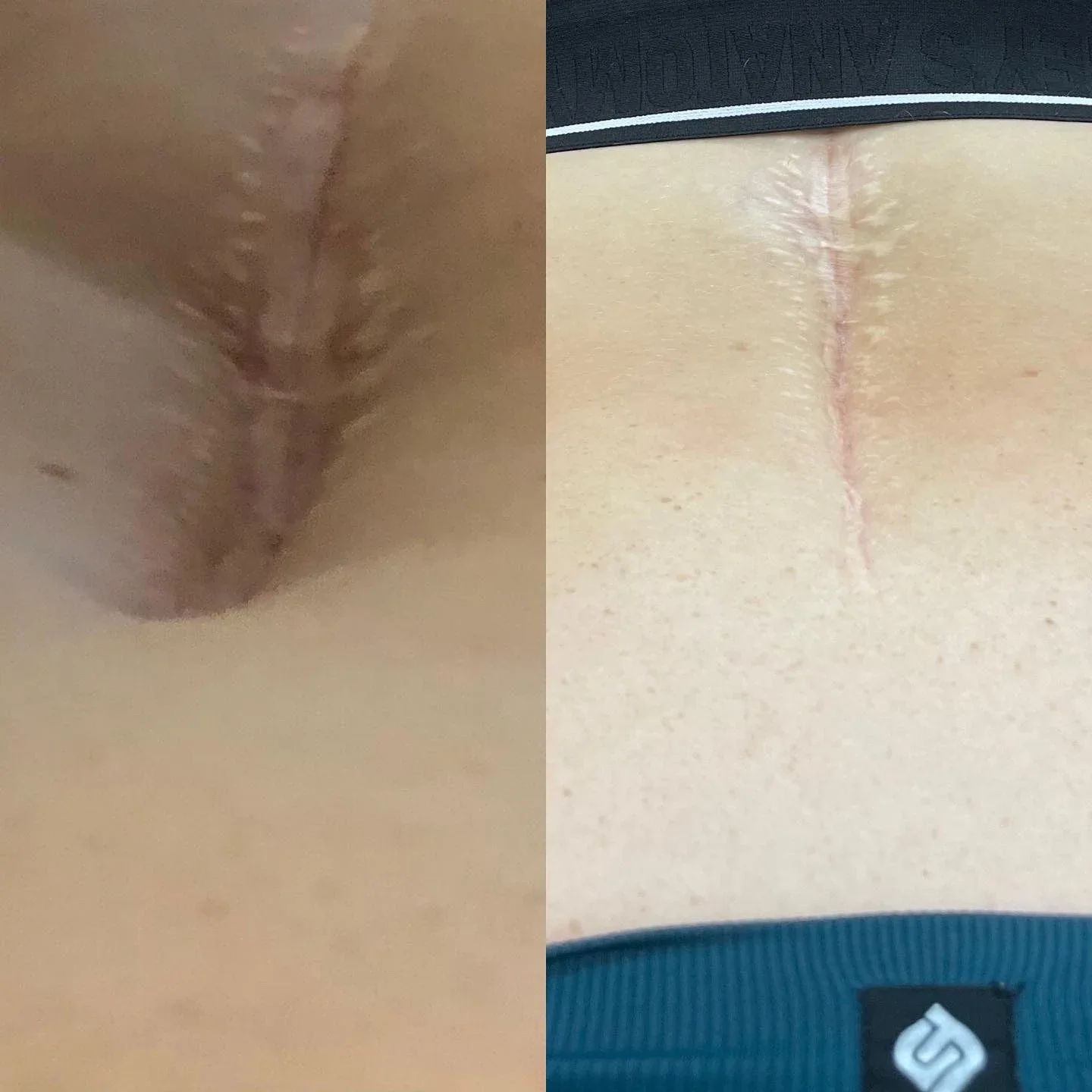 “I have spina bifidia occulta and have had 4 back surgeries for it. My pain was constantly at a level 7 or higher all the time radiating down into my hips, butt, groin, and legs. Johnny used massage, PNF stretching, and cupping on me and let me tell you it has changed my life! He used cupping directly on my surgery scar (I scar deep with keloids) and not only did the appearance and depth of my scar change drastically the pain in my low back, hips, butt, groin, and legs went way down to a manageable 1 or 2 pain level. Johnny is professional, knowledgeable, and damn good at what he does! This is a before and after of my back scar. Check him out!”